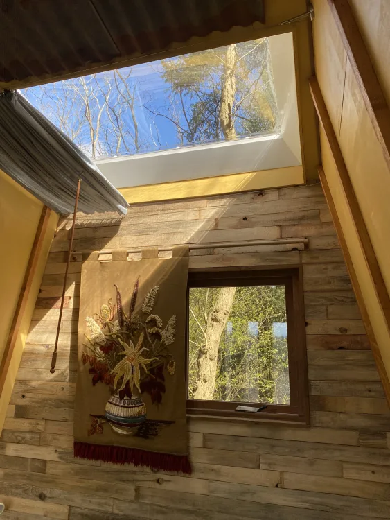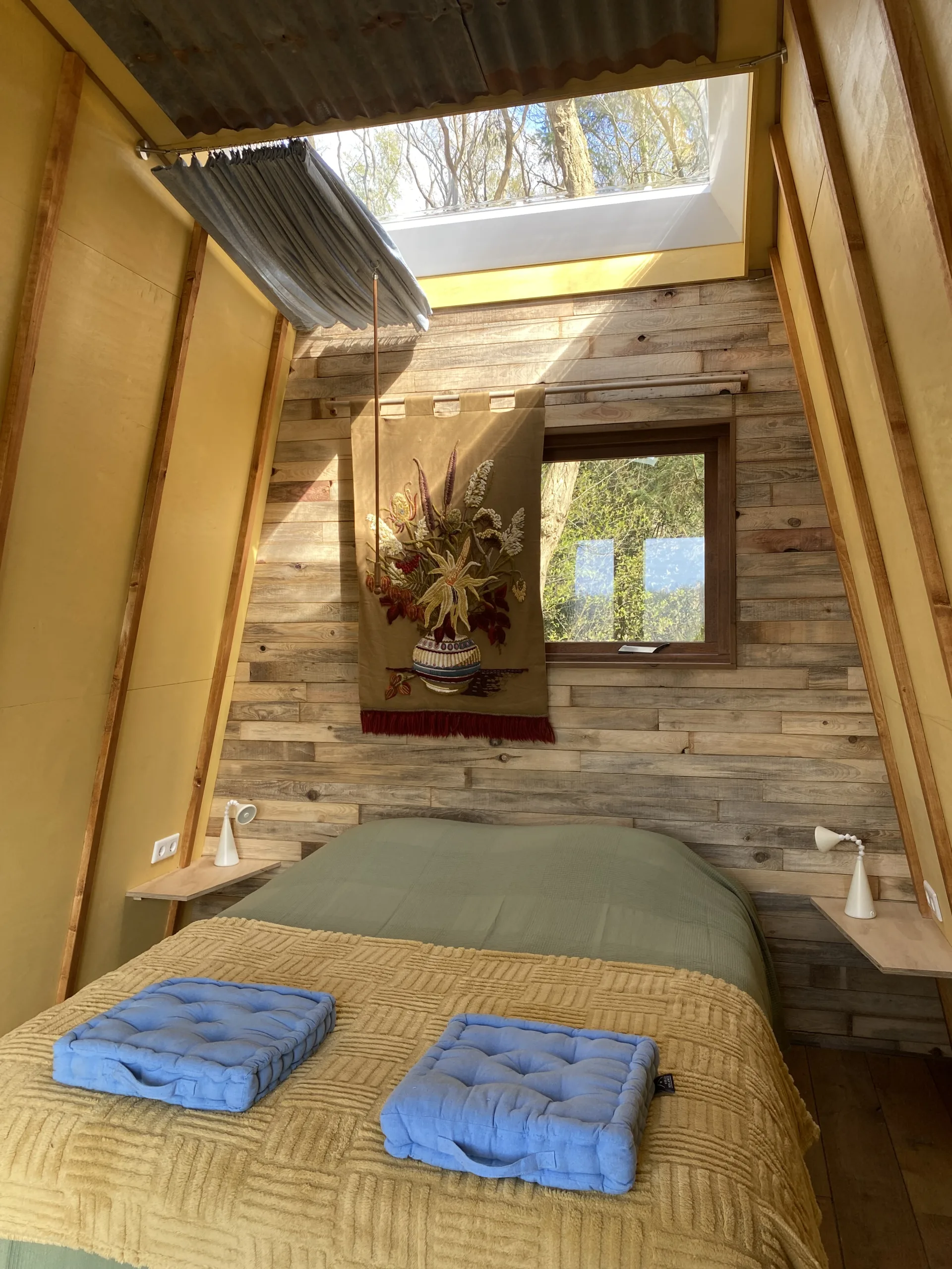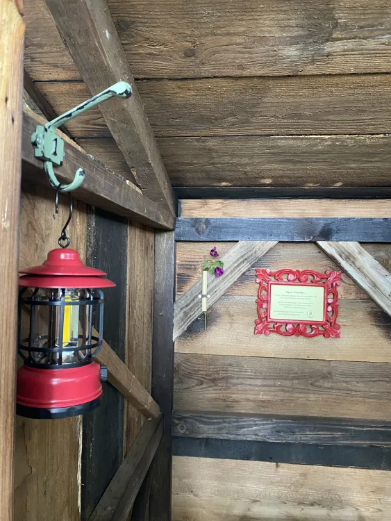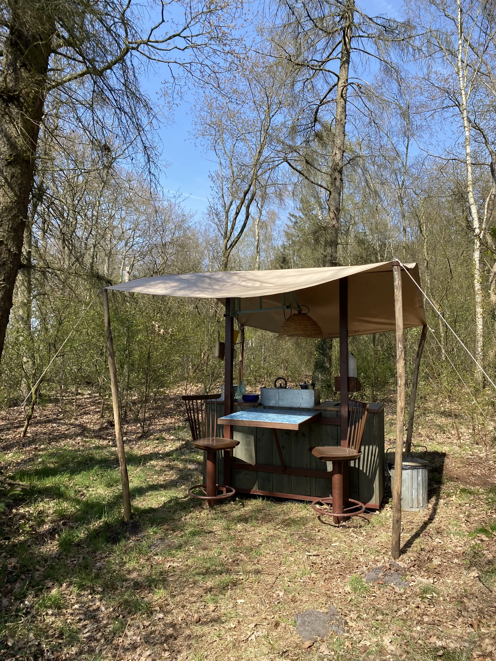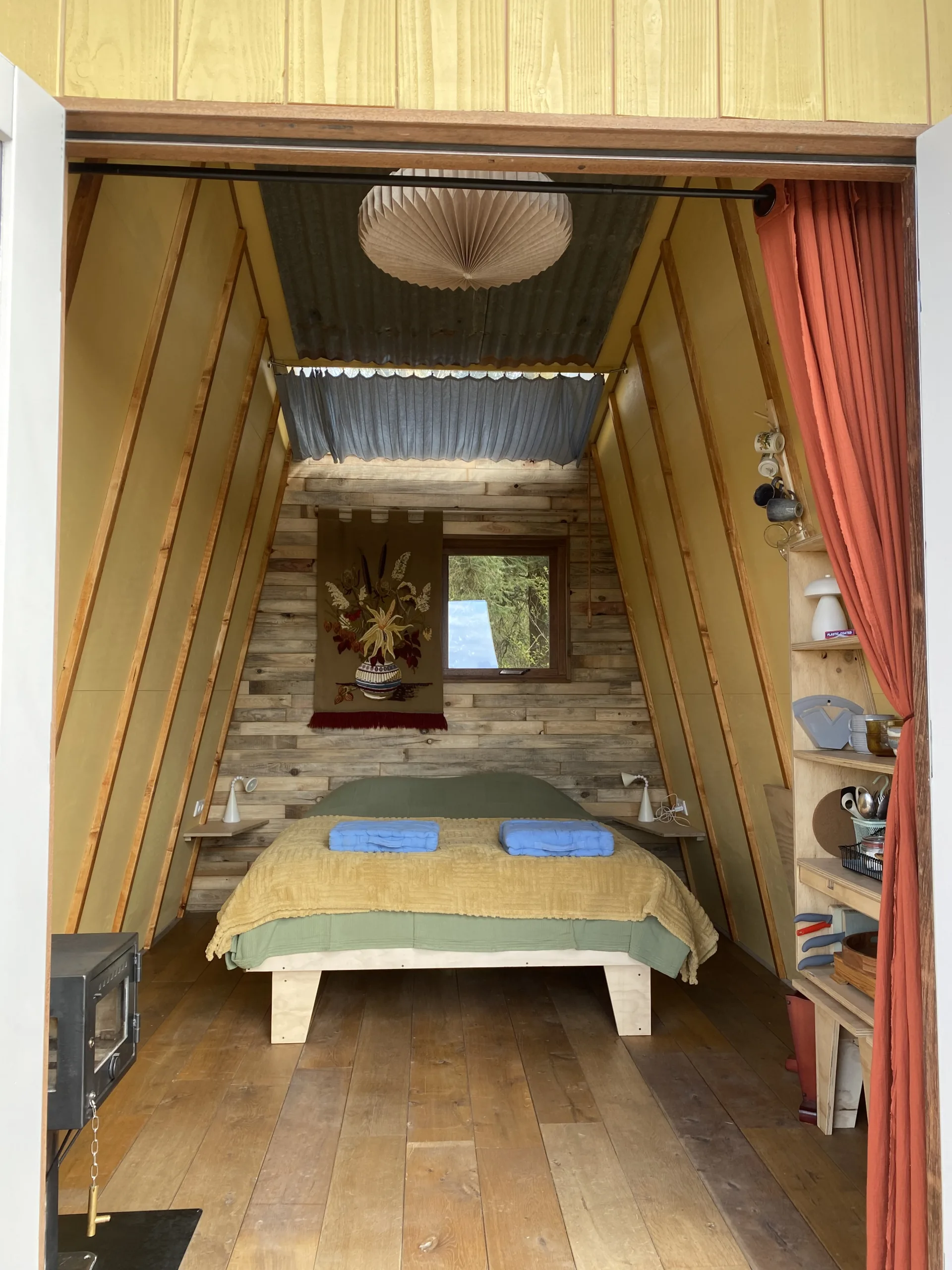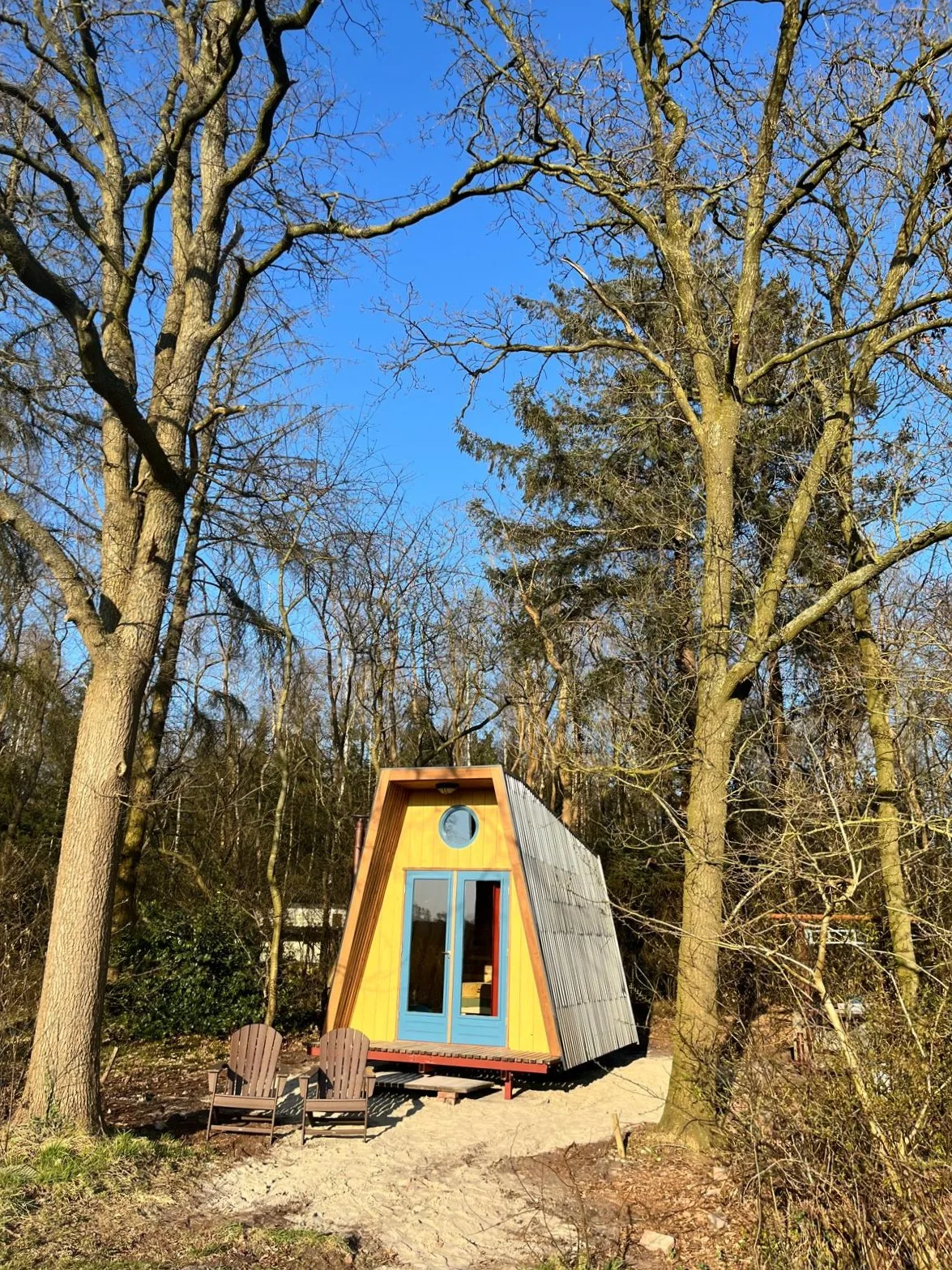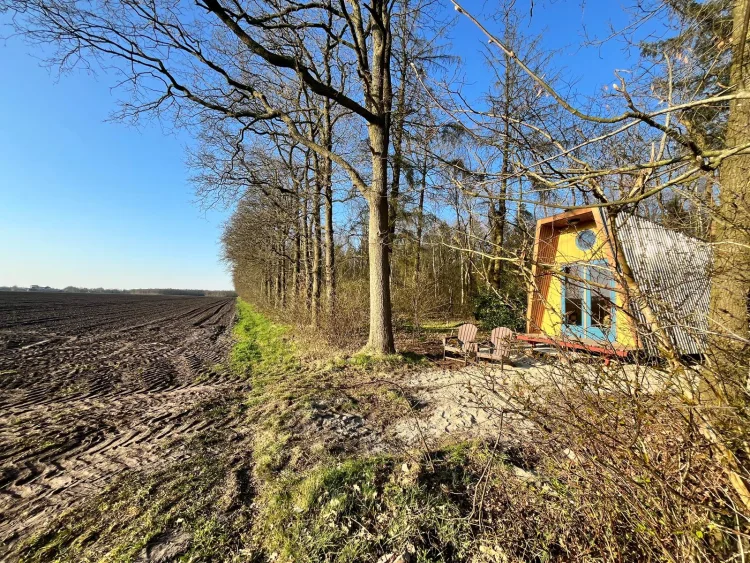 Onder Zeil en BlikVeld staan aan dezelfde bosrand. In de basis zijn beide huisjes gelijk maar zoals dat gaat wanneer hergebruik en creativiteit in het spel zijn, worden beiden toch ook weer uniek. De puien hebben een eigen look door de tweede en derde hands deuren. BlikVeld heeft een cortenstaal dakbedekking wat door het spel der elementen zo’n mooie bruine roestige looks geeft. Het interieur van beiden kleuren hun eigen smaak en een opmerkelijk verschil zit hem ook in de bed situatie. Blikveld heeft het tweepersoonsbed met alle pootjes op de grond, je kunt van beide kant gemakkelijk in en uitstappen.