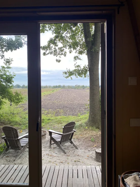 Tweepersoons Natuurhut, met sterrenkijkvenster, houtkachel en openslaande deuren met weids uitzicht over het veld en zonsondergang. Idyllische stek aan de bosrand met buitenkeuken en vuurplaats.