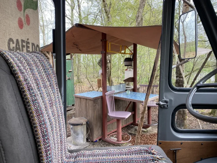 Een relaxte bus met languit tweepersoonsbed, op een geweldig plekje aan het meer, met buitenkeuken, kampvuurplek en hangmat. Je eigen Walhalla!