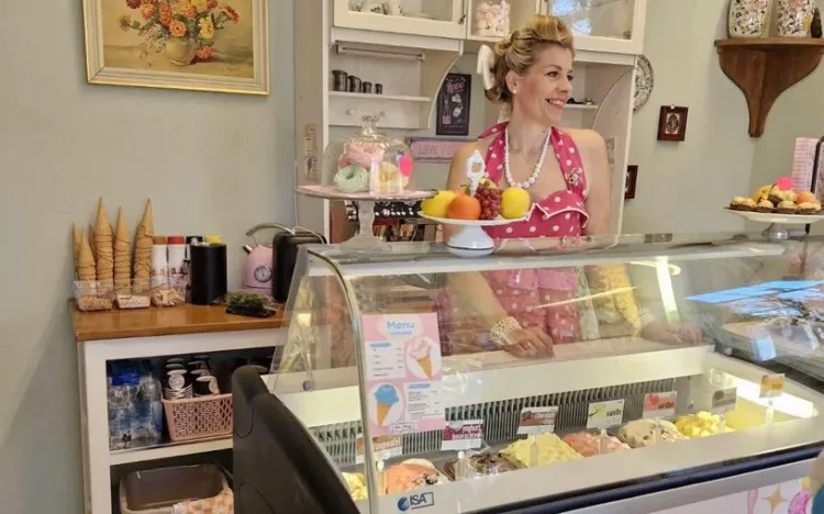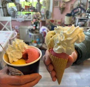 - Zelfde ingang, deur naar rechts verkoopt buurvrouw Joyce Zoet en Vintage: curiosa en ambachtelijk schepijs.