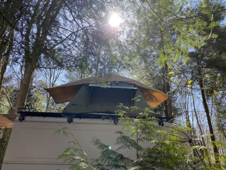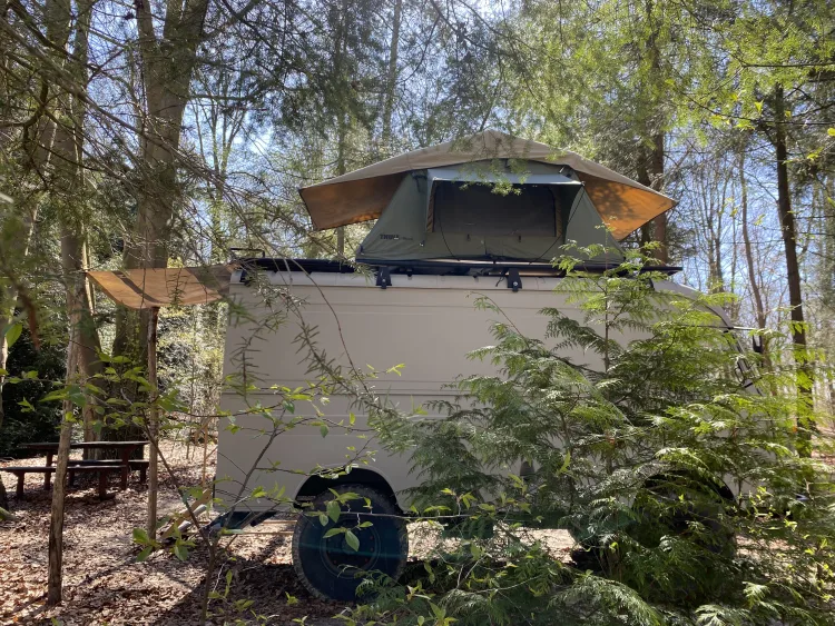 De bus is voorzien van een gloednieuwe Thule Tepui Kukenam daktent! Hier kunnen 2 personen ruim in slapen. En van het uitzicht genieten. Te bereiken via een vaste trap, speciaal voor deze combi geïnstalleerd.