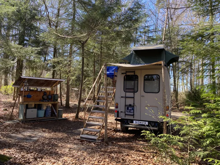 Nomad zelf heeft in totaal 4 slaapplaatsen: 2 in de daktent en 2 in de bus. Ben je met meer, dan is het goede nieuws dat er even verderop nog andere leuke Tralaluna Pop-Up staan: LouLou, Otje, Sprite en Wodan. En nog wat verderop in het bos een aantal Tralaluna huisjes: Oehoe, Hubus, Silo en Kwaak. Dus, tel maar op en reken maar uit!