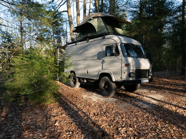 Nomad is een stoere kampeerwagen met daktent voor de fitte outdoor kampeerder. De kenner herkent een Saviem 4×4 bus bouwjaar 1970. Eens een ziekenwagen in het Franse leger, ingezet voor oefeningen.